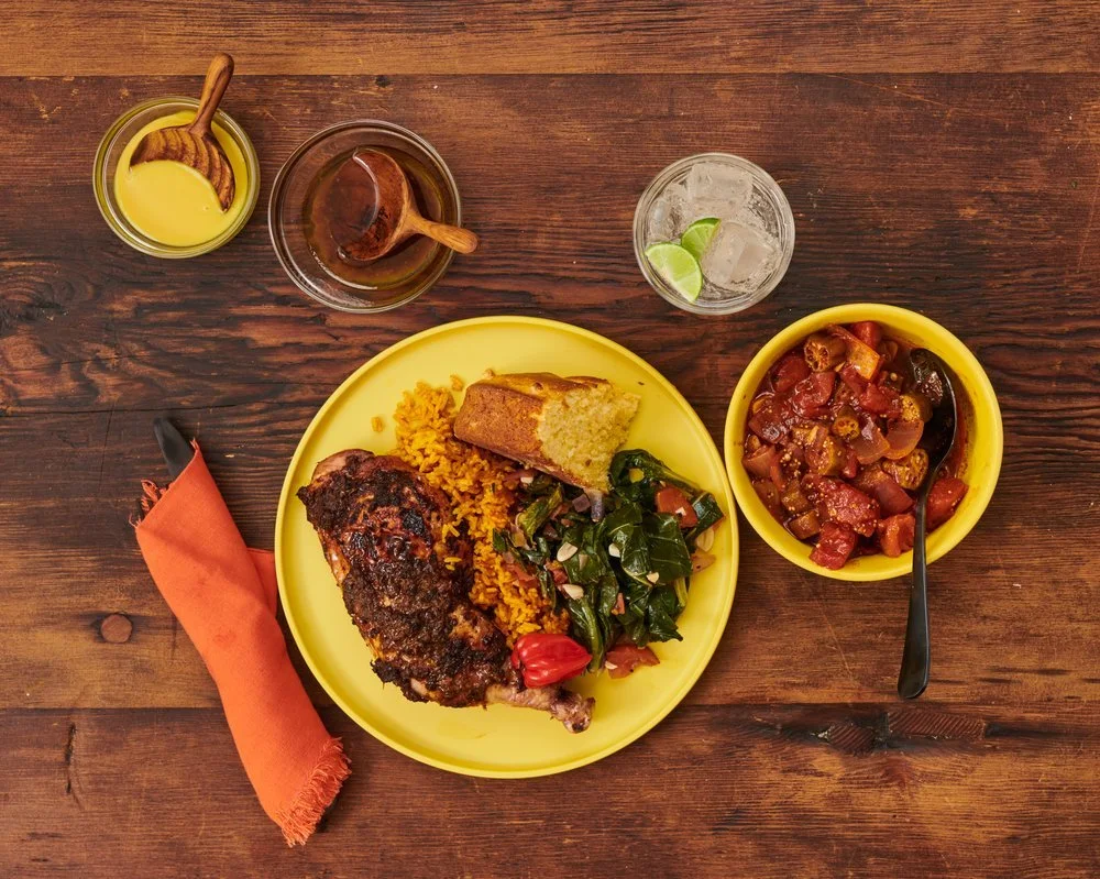 Jerk Chicken Over Bahamian Rice with Callaloo and Okra - African Diaspora Meal