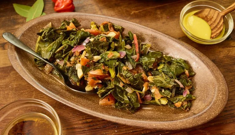 - Heat the oil in a large Dutch oven pan. Add the onion and garlic and cook for a few minutes until translucent. Add the diced tomatoes and peppers. Add the seasonings, collard greens, and broth.