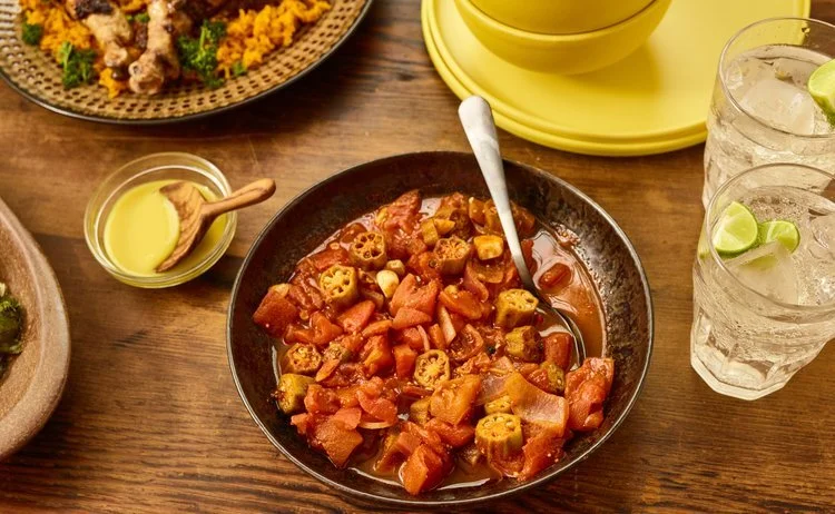 - Saute the onion and garlic in the oil. Add the okra, tomatoes, seasonings, and broth. Bring to a boil. Reduce heat to simmer.